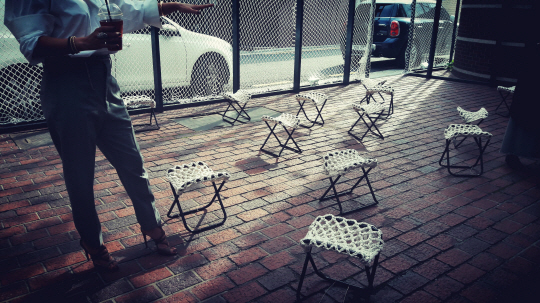 실제로 새하얀 그물이 드리워진 붉은 벽돌 건물의 진화랑은 독특한 분위기를 자아냈다. 햇빛이 비치면 그물에 달린 수 백, 수 천 개의 바람개비가 그림자로 드리워지며 아름다움을 만들어낸다. 이혜영은 처음 시도해보니 '역시 도전을 멈추지 말아야겠다'라는 확신을 가졌단다. 다음 전시 때는 더 큰 설치와 조형물도 만들고자 한다고. '뭐 어때? 하면 되는거지!' 라는 생각이 들게 끔 해주었던 오히려 고마운 작업이었다는 소회를 밝혔다. 함께 배치된 작은 스툴 역시 그녀의 아이디어. 뜨개질로 그물과 함께 하나의 작품처럼 만들고 싶었다고 한다.