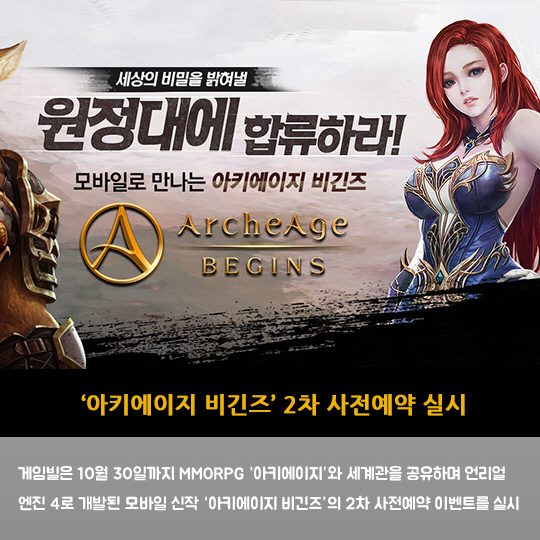 게임빌은 10월 30일까지 MMORPG '아키에이지'와 세계관을 공유하며 언리얼 엔진 4로 개발된 모바일 신작 '아키에이지 비긴즈'의 2차 사전예약 이벤트를 실시