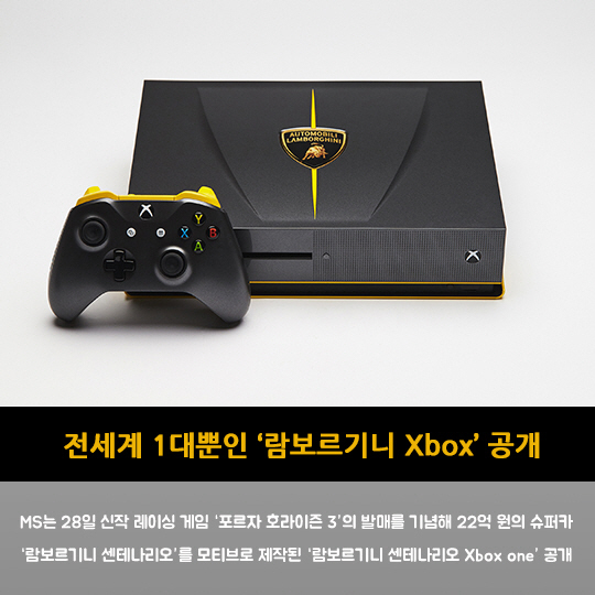 MS는 28일 신작 레이싱 게임 '포르자 호라이즌 3'의 발매를 기념해 22억 원의 슈퍼카 '람보르기니 센테나리오'를 모티브로 제작된 '람보르기니 센테나리오 Xbox one' 공개