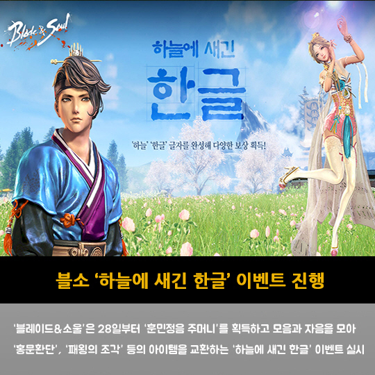 '블레이드&소울'은 28일부터 '훈민정음 주머니'를 획득하고 모음과 자음을 모아 '홍문환단', '패욍의 조각' 등의 아이템을 교환하는 '하늘에 새긴 한글' 이벤트 실시