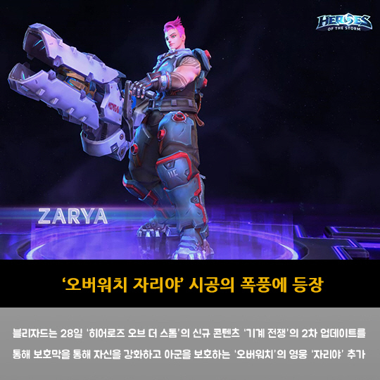 블리자드는 28일 '히어로즈 오브 더 스톰'의 신규 콘텐츠 '기계 전쟁'의 2차 업데이트를 통해 보호막을 통해 자신을 강화하고 아군을 보호하는 '오버워치'의 영웅 '자리야' 추가