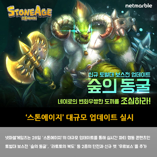 넷마블게임즈는 28일 '스톤에이지'의 대규모 업데이트를 통해 실시간 파티 협동 콘텐츠인 토벌대 보스전 '숲의 동굴', '라토토의 복도' 등 2종의 던전과 신규 펫 '우르보스'를 추가