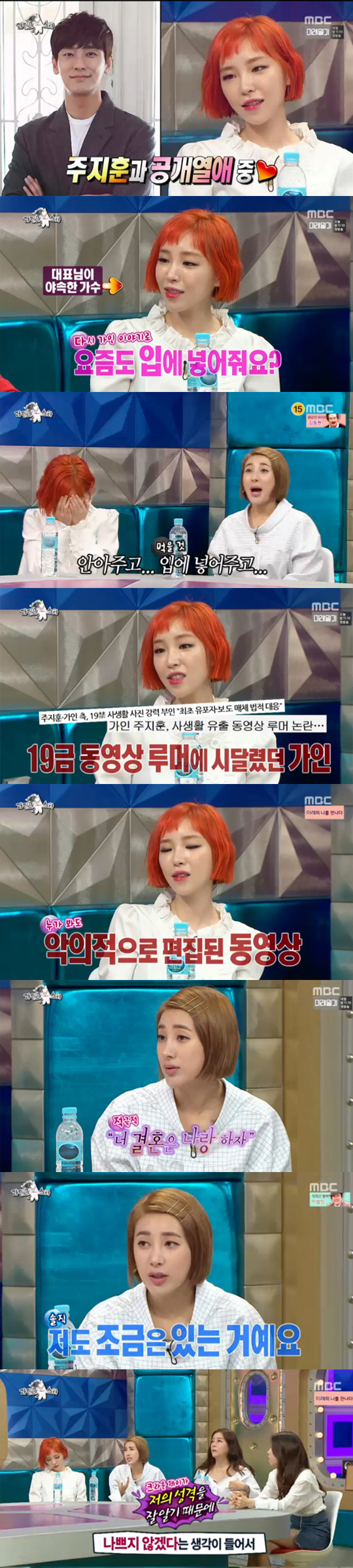 이어 가인은 "선물을 주고 받을 때 '제품의 모델명'을 말한다. 영수증도 첨부해 맘에 안 들면 바꾸도록 한다"며 쿨한 연애를 강조했다. 하지만 이어 공개된 가인-주지훈 커플의 목격담에 따르면 두 사람은 서로 안아주고 먹여주며 '할건 다하는' 커플임이 밝혀졌다. 방송 말미엔 "이왕 이렇게 된거, 제 신곡과 함께 영화 '아수라'도 사랑해달라"고 덧붙였다.