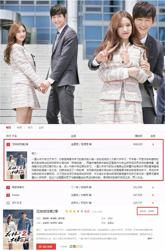 지난 24일 중국서 공개된 '두근두근 스파이크2'는 공개 5일만에 200만뷰(2016.09.28 기준)를 돌파했다. 또한 굳건히 상위권을 사수하고 있는 '고품격 짝사랑', '힐러', '고호의 별이 빛나는 밤에' 등 중국 내에서 인기몰이중인 한국드라마 사이에서 일간재생수 1위를 차지해 돌풍을 일으키고 있다.