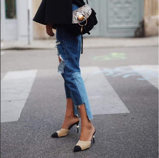 블랙과 아이보리 배색이 매력적인 클래식한 백오픈 슈즈는 페미닌하면서도 캐주얼한 스타일에 잘 어울린다. 아미송은 볼드한 와이드 커프스가 매력적인 블랙 톱에 데미지 디테일이 과감하게 들어간 디스트로이드 크롭 진을 함께 매치했다. 거기에 벨트가 살짝 보이도록 연출한 것은 이질적인 느낌의 상 하의를 더욱 더 조화롭게 만들어준다. 거기에 골드 컬러의 후프가 프론트에 장식된 파이톤 커버 미니백으로 베이직한 스타일링에 유니크한 포인트를 더했다.