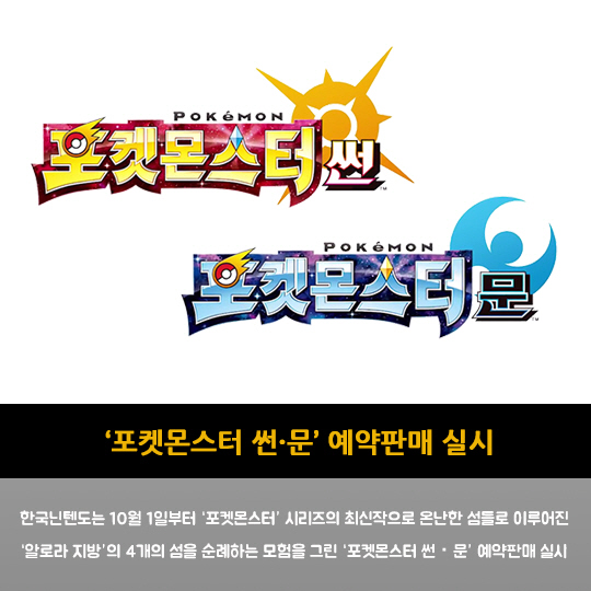 한국닌텐도는 10월 1일부터 '포켓몬스터' 시리즈의 최신작으로 온난한 섬들로 이루어진 '알로라 지방'의 4개의 섬을 순례하는 모험을 그린 '포켓몬스터 썬 문' 예약판매 실시