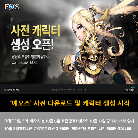 카카오게임즈의 '에오스'는 10월 6일 사전 공개서비스와 10월 13일 공개서비스에 앞서 10월 5일까지 사전 다운로드와 신규 캐릭터 '팔라딘'을 포함한 사전 캐릭터 생성 시작