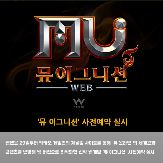 웹젠은 29일부터 카카오 게임즈의 채널링 사이트를 통해 '뮤 온라인'의 세계관과 콘텐츠를 반영해 웹 버전으로 최적화한 신작 웹게임 '뮤 이그니션' 사전예약 실시