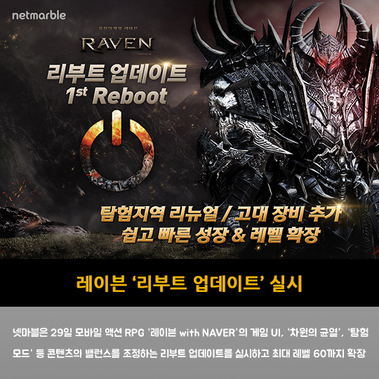 넷마블은 29일 모바일 액션 RPG '레이븐 with NAVER'의 게임 UI, '차원의 균열', '탐험 모드' 등 콘텐츠의 밸런스를 조정하는 리부트 업데이트를 실시하고 최대 레벨 60까지 확장