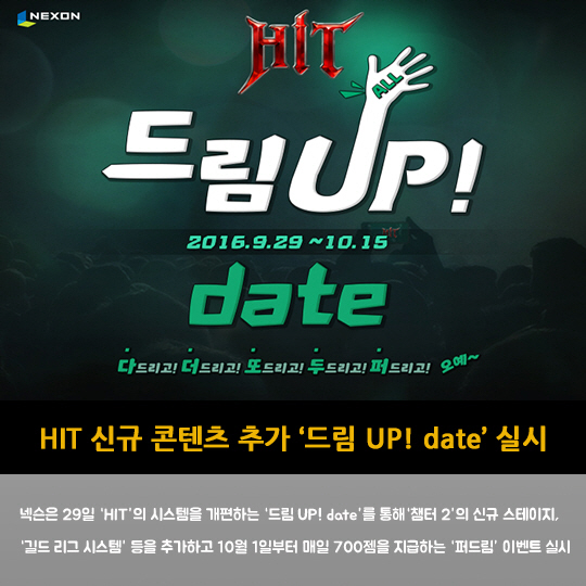 넥슨은 29일 'HIT'의 시스템을 개편하는 '드림 UP! date'를 통해'챔터 2'의 신규 스테이지, '길드 리그 시스템' 등을 추가하고 10월 1일부터 매일 700젬을 지급하는 '퍼드림' 이벤트 실시