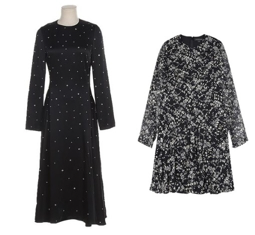 공식행사인 포토월과 시사회 현장에서는 레드카펫의 화려함을 돋구는 롱 실크 드레스를 택했습니다. 블랙의 무거움과 강렬함, 화이트 도트 패턴의 청아한 매력이 조화를 이뤄 반짝반짝 빛나는 듯한 매력적인 룩을 연출했네요. 롱 드레스는 김태리와 같은 아담한 체구에는 다소 답답하게 느껴질 수 있지만, 적절한 소매 길이와 누드톤 펌프스를 활용해 우아함으로 승화한 센스가 돋보입니다.