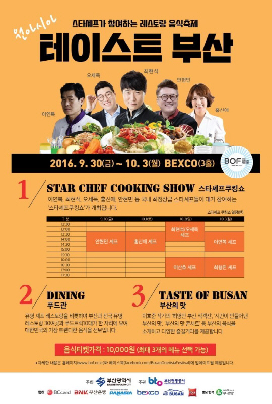 BOF는 사업단은 "부산을 방문한 국내외 관광객들에게 한국을 대표하는 트렌디한 음식을 소개하고 부산 시민들에게는 TV에서만 보던 스타셰프들의 음식을 직접 만나게 함으로써 방송과 또 다른 모습과 활약이 색다른 재미를 선사할 것"이라며 "글로벌 관광객과 시민이 하나될 수 있는 축제의 장이 되기를 기대한다"고 전했다.