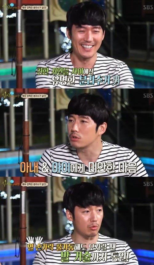 이날 김수로는 "장혁이 분리수거를 잘 한다. 분리수거를 해야 한다고 집에 간다고 말하기도 한다. 실제로 분리수거하고 다시 (모임에) 오기도 한다"고 폭로했다.