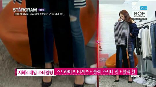 서지혜는 이어 사랑하는 패션 아이템으로 청바지를 꼽았다. 옷장 속 애정템들을 골라 선보였는데 올 가을 데님 스타일링 팁도 함께 공개해 관심을 끌었다. 그녀가 선택한 아이템은 스트라이프 보트넥 티셔츠와 블랙 스키니진, 그리고 반짝이는 큐빅 디테일이 돋보이는 블랙 힐이었다. 거기에 블랙 페도라까지 더해주면 가을 분위기 물씬~ 평범한 청바지도 평범하지 않게 코디하는 서지혜는 과연 뭘 입어도 여신다운 8등신 미녀였다.