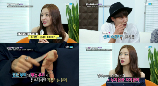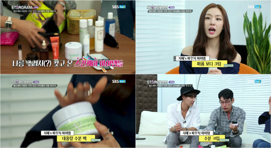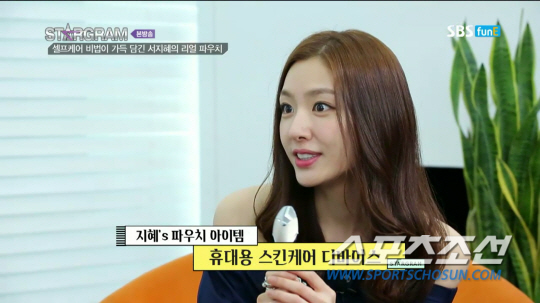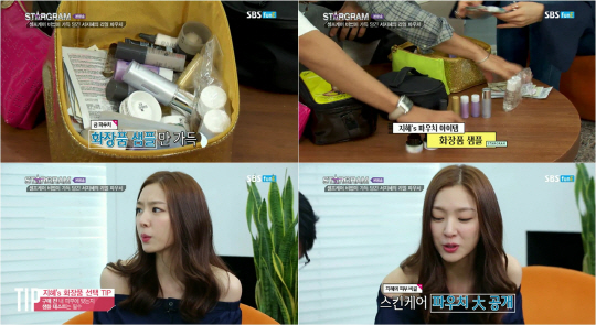 어김없이 파우치 공개시간! 서지혜는 집에서 사용하는 파우치 그대로 들고왔다. 큰 파우치 하나 가득 채운 것은 바로 샘플. 화장품 구입 전, 제품이 자신의 피부에 맞는지의 여부를 체크해보기 위해서는 샘플을 사용해보는 것이 중요하다고. 이어 다양한 스킨케어 아이템을 함께 공개했다. 그녀는 향수 브랜드에서 나오는 보디크림으로 매일 기분 좋게 보디를 케어하는 것은 물론 잦은 촬영과 두꺼운 촬영용 메이크업에 지친 피부를 위해 수분 팩과 수분크림을 꼼꼼히 챙겨바른다고 전했다.