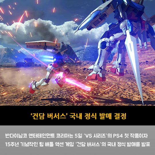 반다이남코 엔터테인먼트 코리아는 5일 'VS 시리즈'의 PS4 첫 작품이자 15주년 기념작인 팀 배틀 액션 게임 '건담 버서스'의 국내 정식 발매를 발표