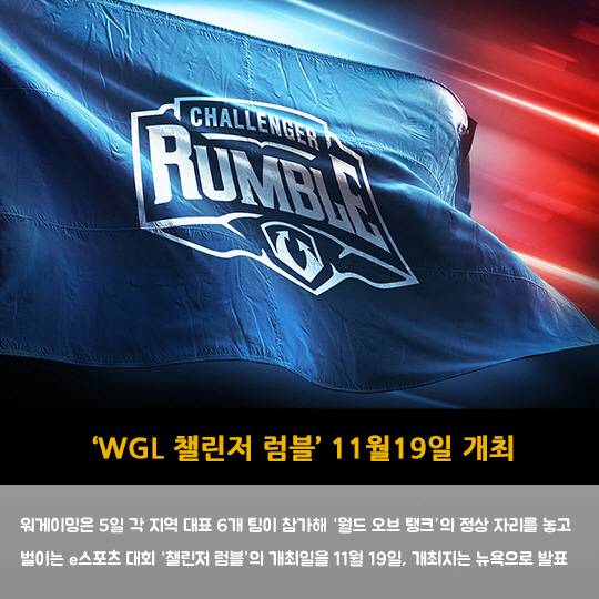 워게이밍은 5일 각 지역 대표 6개 팀이 참가해 '월드 오브 탱크'의 정상 자리를 놓고 벌이는 e스포츠 대회 '챌린저 럼블'의 개최일을 11월 19일, 개최지는 뉴욕으로 발표