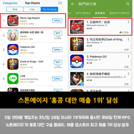 5일 넷마블 게임즈는 지난달 28일 아시아 78개국에 출시된 모바일 턴제 RPG '스톤에이지'의 홍콩 대만 구글 플레이, 애플 앱스토어 최고 매출 1위 달성 발표