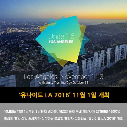 유니티는 11월 1일부터 3일까지 넷마블, 게임빌 등의 국내 개발사가 참가하며 1600명 이상의 게임 산업 종사자가 참석하는 글로벌 개발자 컨퍼런스 '유나이트 LA 2016' 개최