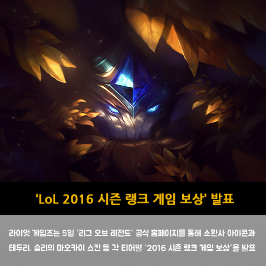 라이엇 게임즈는 5일 '리그 오브 레전드' 공식 홈페이지를 통해 소환사 아이콘과 테두리, 승리의 마오카이 스킨 등 각 티어별 '2016 시즌 랭크 게임 보상'을 발표