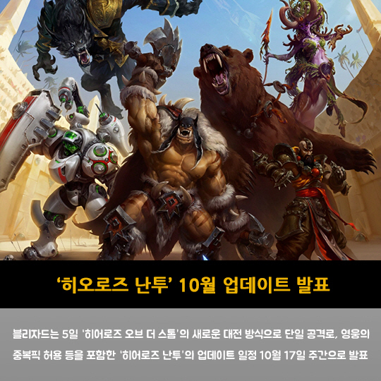 블리자드는 5일 '히어로즈 오브 더 스톰'의 새로운 대전 방식으로 단일 공격로, 영웅의 중복픽 허용 등을 포함한 '히어로즈 난투'의 업데이트 일정 10월 17일 주간으로 발표
