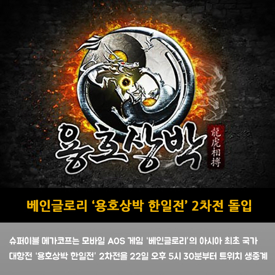 슈퍼이블 메가코프는 모바일 AOS 게임 '베인글로리'의 아시아 최초 국가 대항전 '용호상박 한일전' 2차전을 22일 오후 5시 30분부터 트위치 생중계