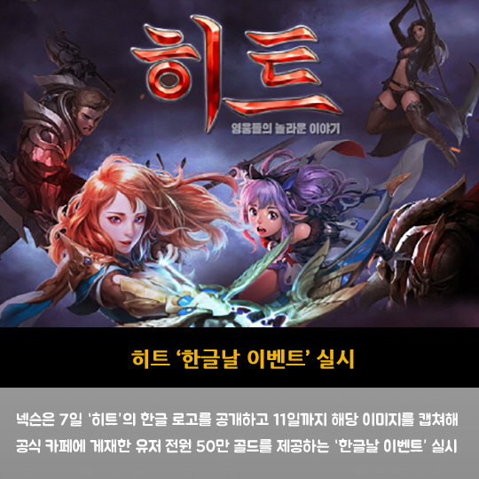 넥슨은 7일 '히트'의 한글 로고를 공개하고 11일까지 해당 이미지를 캡쳐해 공식 카페에 게재한 유저 전원 50만 골드를 제공하는 '한글날 이벤트' 실시