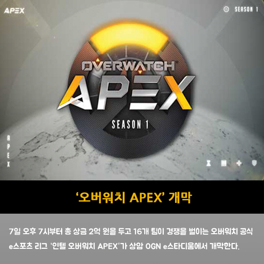 7일 오후 7시부터 총 상금 2억 원을 두고 16개 팀이 경쟁을 벌이는 오버워치 공식 e스포츠 리그 '인텔 오버워치 APEX'가 상암 OGN e스타디움에서 개막한다.