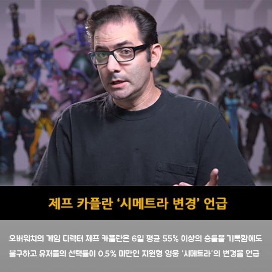 오버워치의 게임 디렉터 제프 카플란은 6일 평균 55% 이상의 승률을 기록함에도 불구하고 유저들의 선택률이 0.5% 미만인 지원형 영웅 '시메트라'의 변경을 언급