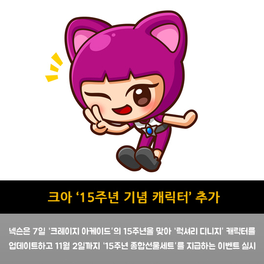 넥슨은 7일 '크레이지 아케이드'의 15주년을 맞아 '럭셔리 디니지' 캐릭터를 업데이트하고 11월 2일까지 '15주년 종합선물세트'를 지급하는 이벤트 실시