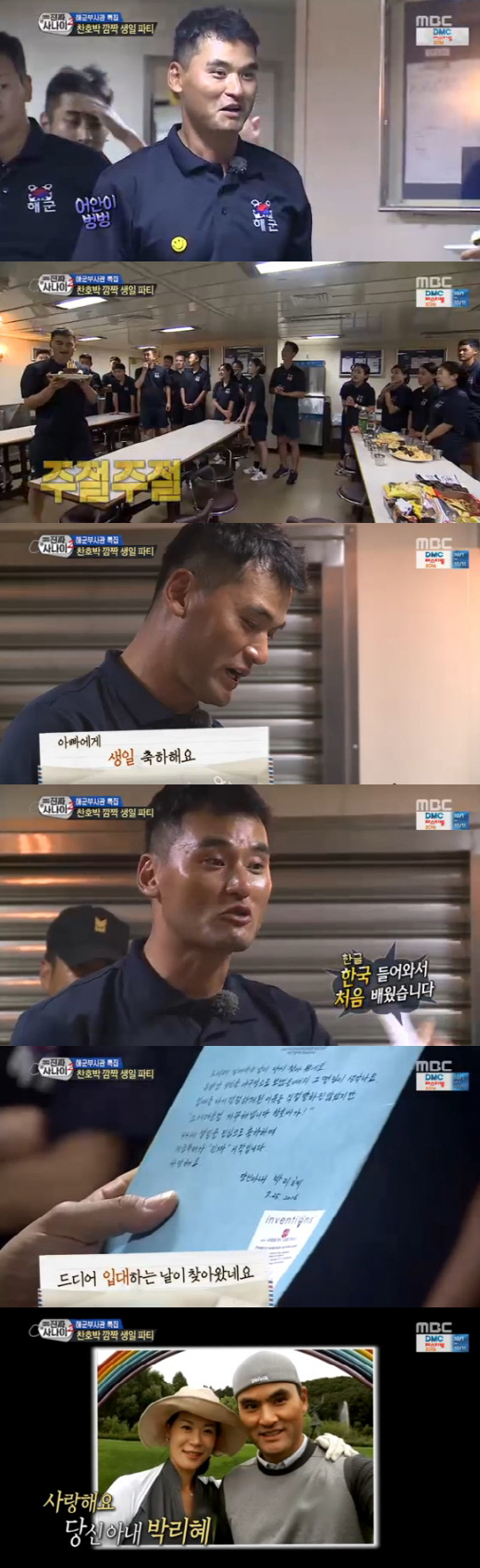 그리고 뒤이어 박찬호에게 깜짝 선물이 등장했다. '유류 공수급' 훈련 때 '대청함'이라는 또 다른 배에서 배달된 선물 상자가 바로 그것. 선물 상자 안에는 아내와 딸들의 정성 가득한 총 3통의 손편지가 들어있었다. 그는 한자 한자 정성스럽게 쓰여진 딸의 첫 한글 편지와 아내의 사랑 가득한 편지를 읽으며 감격의 눈물을 흘렸다.