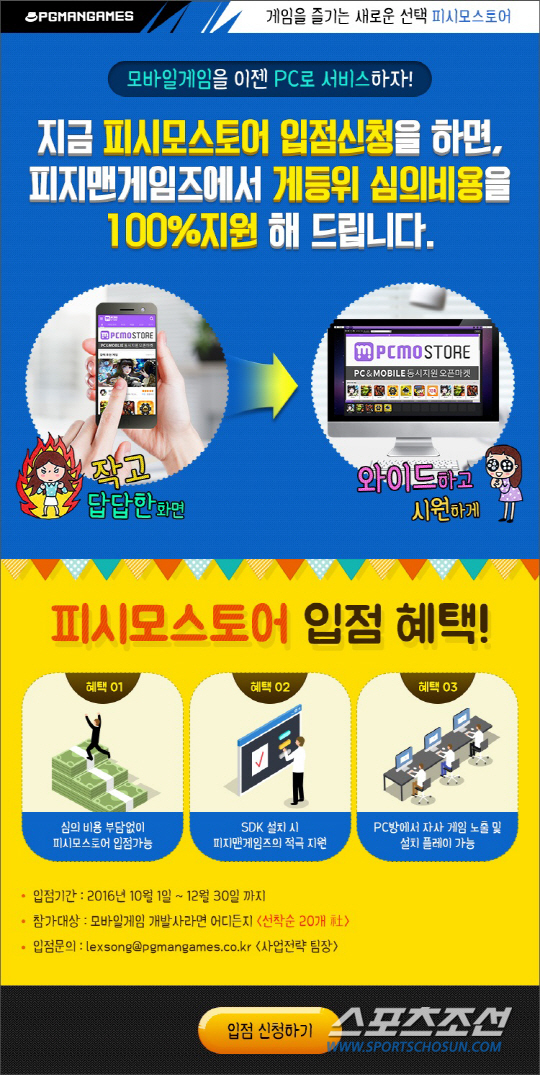 피지맨게임즈는 올 12월까지 피시모스토어 입점하는 모바일게임 개발사들을 대상으로 3가지 입점 혜택을 제공한다. 우선 피시모스토어 입점 시 게임물등급위원회의 심사비용을 전액 부담해 게임사들의 비용 부담을 줄여준다. 또 SDK 삽입 시 설치에 대해서도 적극 지원한다. SDK는 피시모스토어 플랫폼에서 해당 게임이 구동되도록 하는 프로그램으로, 설치에 대한 개임 개발사들의 작업시간을 줄여주기 위해 지원한다고 회사측은 밝혔다. 이밖에 PC방에서도 설치 및 플레이 할 수 있어 게임 유저층을 넓힐 수 있을 것으로 보인다.