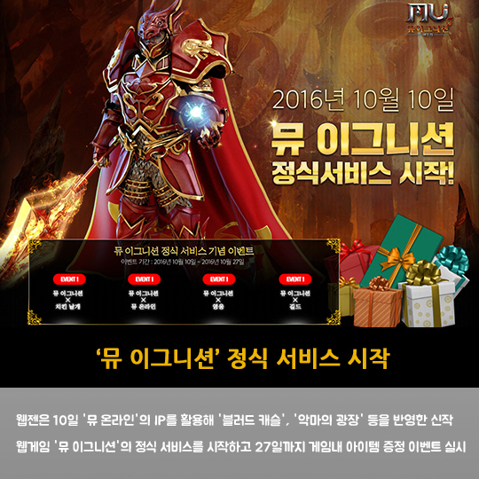 웹젠은 10일 '뮤 온라인'의 IP를 활용해 '블러드 캐슬', '악마의 광장' 등을 반영한 신작 웹게임 '뮤 이그니션'의 정식 서비스를 시작하고 27일까지 게임내 아이템 증정 이벤트 실시