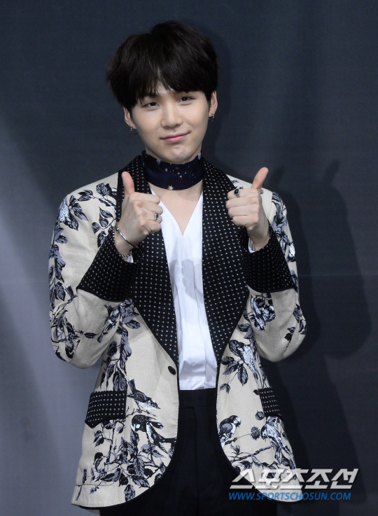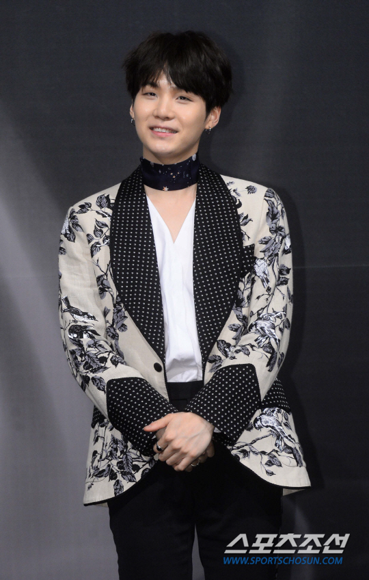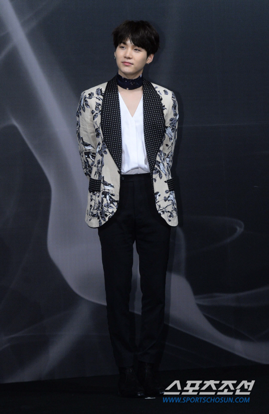슈가는 소프트 액세서리라고 불리는 스카프를 활용한 패션으로 눈길을 끌었다. 스카프를 활용한 패션은 슈가의 부드러운 느낌을 더욱 극대화하는 작용을 했다. 슈가는 화려하게 새와 나뭇잎 패턴이 그려진 재킷을 입었는데, 라펠과 소매, 주머니에만 블랙 도트 패턴으로 포인트가 들어가있어 유니크한 느낌을 자아냈다.
