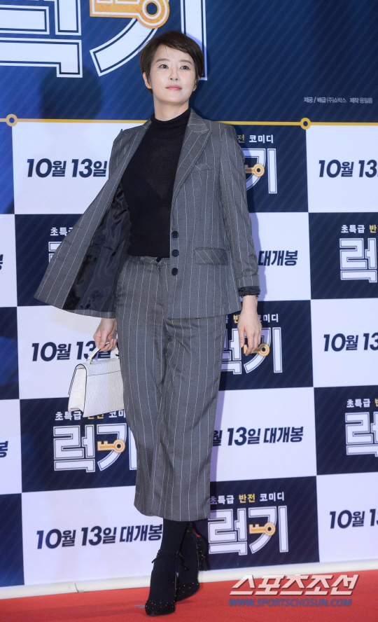 짧은 숏컷 헤어와 스트라이프 수트. 배우 김선아는 도시적인 느낌을 한껏 풍기며 시사회장으로 모습을 드러냈다. 가벼운 핀스트라이프가 가미된 짙은 그레이톤의 수트는 시크하고 멋진 여성의 느낌을 더했다. 블랙 하이탑 니트와 세로 스트라이프 패턴이 더해져 김선아의 몸매를 더욱 날씬하게 보이게 연출했다.