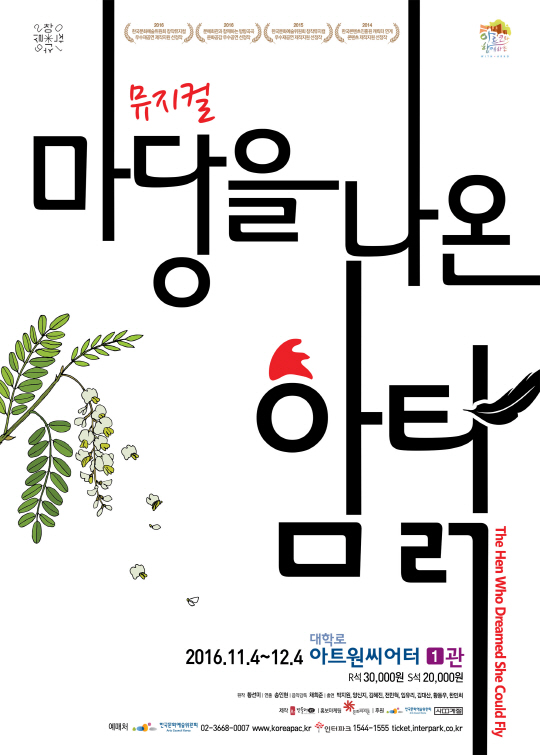 올해 초 국악이 가미된 가족 음악극으로 선보여 좋은 반응을 얻었던 극단 민들레의 뮤지컬 '마당을 나온 암탉'(원작 황선미, 연출 송인현)이 11월 4일부터 12월 4일까지 대학로 아트원씨어터 1관에서 새로운 옷을 입고 관객과 만난다.