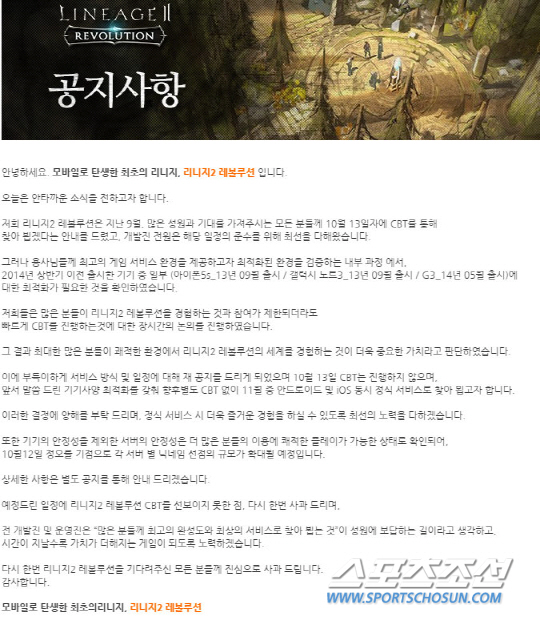 넷마블은 공식카페를 통해 "많은 분들이 리니지2 레볼루션을 경험하는 것과 참여가 제한되더라도 빠르게 CBT를 진행하는 것에 대한 장시간의 논의를 진행했다. 그 결과 최대한 많은 분들이 쾌적한 환경에서 리니지2 레볼루션의 세계를 경험하는 것이 더욱 중요한 가치라고 판단했다"고 밝히며,