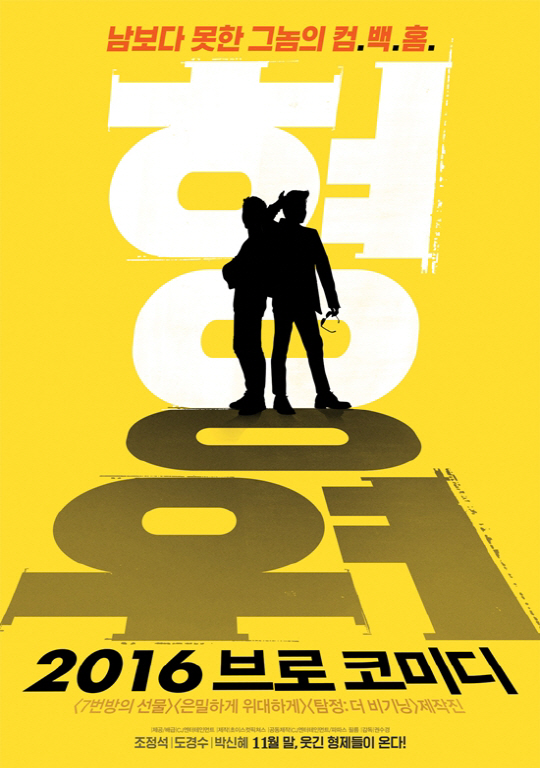 공개된 컴백'형' 런칭 포스터는 색다른 포스터 명칭으로 눈길을 사로잡는다. 두 배우의 실루엣만으로도 강렬한 코믹 포스를 자랑하는 포스터에서 '남보다 못한 그 놈의 컴백홈'이라는 카피를 통해 예상치 못했던 형의 등장으로 펼쳐질 기막힌 동거 스토리를 벌써부터 궁금케 한다. 2016 브로 코미디 '형'은 11월 말 만나볼 수 있다.
