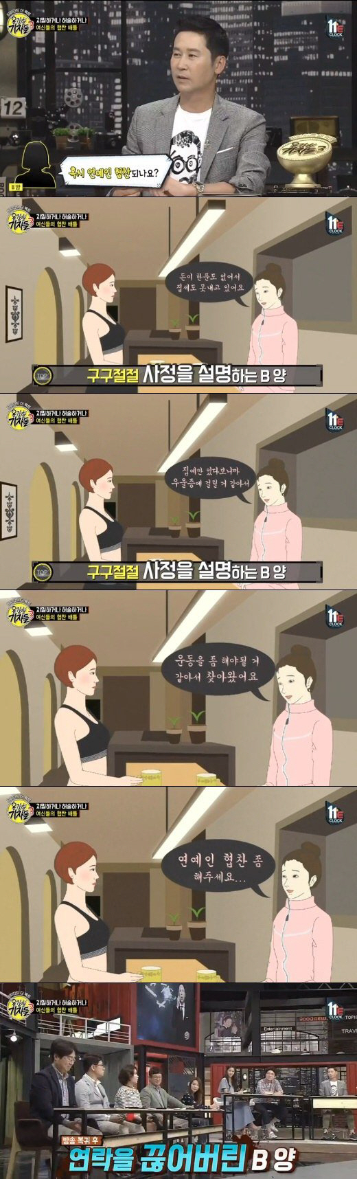 또 기자는 "B양이 강사에 '일을 쉬고 있는데 집세를 못 내고 있다. 현재 벌이가 안 된다. 집에만 있으니 우울증에 걸릴 거 같다. 그래서 운동을 하려고 왔다. 연예인 협찬을 해달라'라고 한탄했고, 측은해진 강사가 운동을 하라고 했더니 매일매일 출근해 운동을 한다더라. 이후 B양은 강사와 친해졌다"라고 덧붙였다.