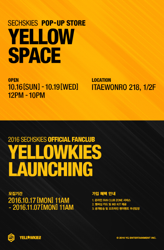 아울러 오는 17일부터는 젝스키스 공식 팬클럽 'YELLOWKIES'의 모집도 시작된다. 이와 관련 13일 젝스키스 공식 홈페이지(http://yg-sechskies.com)에는 팬클럽을 모집을 알리는 프로모션 페이지가 오픈된다. 모집기간은 오는 17일 오전 11시부터 11월 7일 오전 11시 까지다. 가입 관련 상세 정보는 추후 젝스키스 공식홈페이지를 통해 공지될 예정이다.