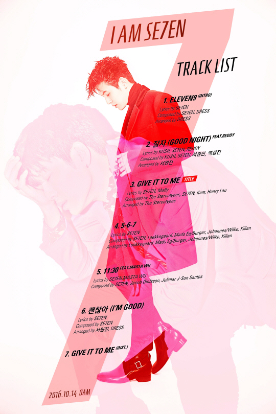 공개된 트랙리스트에는 타이틀곡 '기브 잇 투 미(GIVE IT TO ME)' 이외에도 프로듀서 쿠시(KUSH)와 공동 작업하고 엠넷'쇼미 더 머니 5'에서 활약한 래퍼 레디(Reddy)가 피처링한 '잘자(GOOD NIGHT)'와 래퍼 마스터 우(MASTA WU)가 피처링한 R&B, POP 장르의 곡 '11:30' 등이 수록됐다. 세븐은 한때 한솥밥을 먹은 쿠시, 마스타우 등 YG출신 뮤지션들의 전폭적인 지원 속에 컴백을 준비하게 됐다.