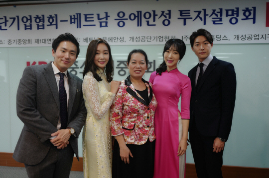 ◇배우 장민영(오른쪽에서 두번째)이 한국과 베트남의 경제 교류 홍보대사로 맹활약하고 있다. 지난 12일 열린 투자설명회 후 기념촬영을 하고 있는 장민영.