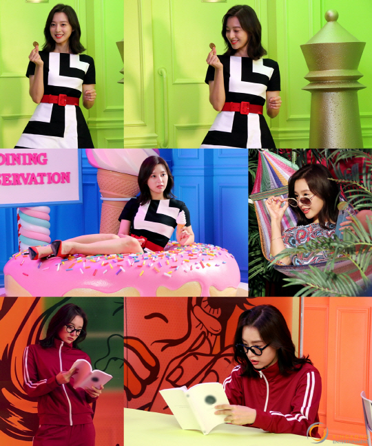 김지원은 여행-맛집 예약, 도서 구매, 쇼핑, 게임과 웹툰 등이 가능한 모바일 플랫폼 컨셉트에 맞게 다양한 표정과 의상, 분위기를 연출했다.
