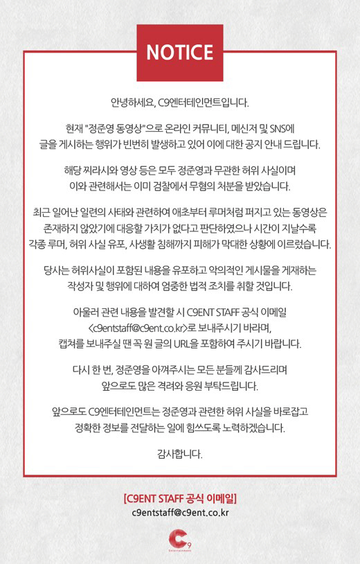 14일 정준영의 소속사 C9엔터테인먼트는 "현재 '정준영 동영상'으로 온라인 커뮤니티, 메신저 및 SNS에 글을 게시하는 행위가 빈번히 발생하고 있다"며 "허위 사실이 포함된 내용을 유포하고 악의적인 게시물을 게재하는 작성자 및 행위에 대하여 엄중한 법적 조치를 취할 것"이라고 밝혔다.