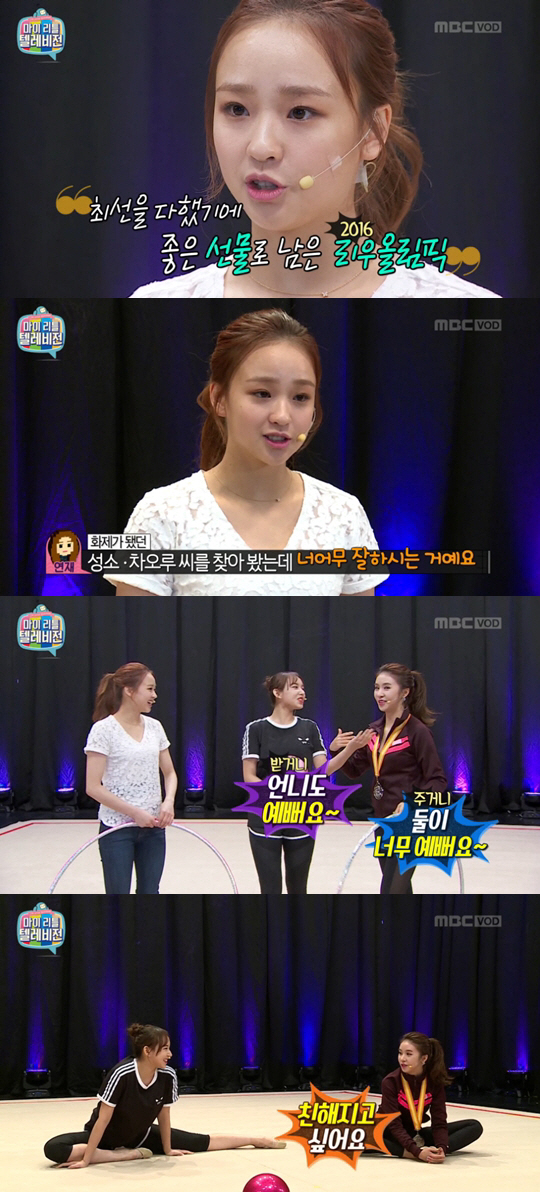 손연재는 "'아육대'에서 화제가 된 성소와 차오루 영상을 찾아봤는데 정말 리듬체조를 잘하더라. 깜짝 놀랐다"며 극찬했다. 이에 성소와 차오루는 몸 둘 바를 몰랐다. 이어 세 사람은 서로 "너무 예쁘다"며 칭찬을 주고받았다. 특히 차오루는 "둘이 너무 예쁘다. 나도 나름 피에스타 비주얼인데 여기서 오징어 됐다"고 너스레를 떨어 웃음을 자아냈다.