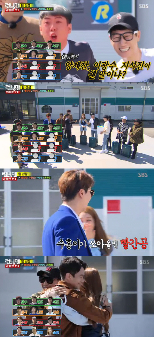 팀 선정 결과, 초록팀 이광수-양세찬-지석진, 주황팀에 김종국-박나래-송지효, 빨간팀 박수홍-개리-유재석, 파랑팀은 이규환-하하-솔빈 나눠지며 본격적인 레이스에 나섰다.