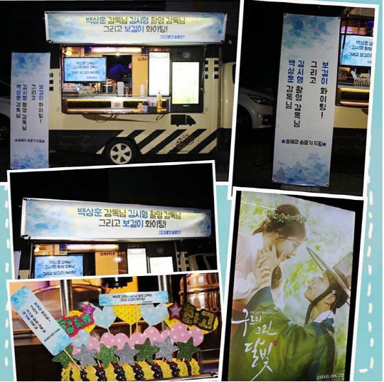 최근 한 커피차 브랜드 인스타그램에는 "드라마 '구르미 그린 달빛' 박보검 배우님 서포트"라는 글과 함께 사진을 공개했다. 사진에는 KBS2 '태양의 후예' 주인공인 송중기, 송혜교 커플이 '구르미 그린 달빛' 촬영장에 선물로 보낸 서포트 커피차 모습이 담겼다. 커피차에는 '백상훈 감독님, 김시형 촬영 감독님, 그리고 보검이 화이팅!'이라는 현수막이 걸려 눈길을 끈다.