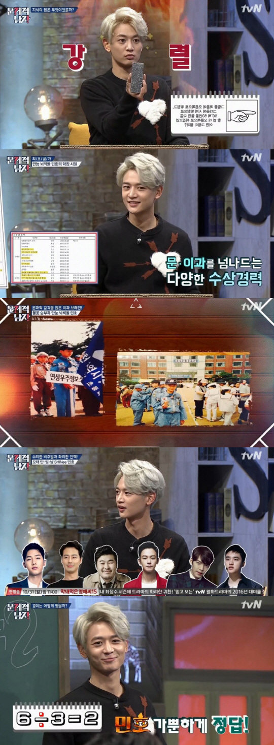 이날 민호는 만화를 찢고 나온 듯한 외모를 뽐내며 등장해 스튜디오를 술렁이게 만들었다. 민호는 승부욕 넘치는 체육돌이자 어린시절 과학을 즐긴 이과 브레인에 문과적 감각까지 모두 갖춘 다재다능한 '뇌섹돌'. "본인을 뇌섹남이라고 생각하냐"는 전현무의 질문에 민호는 "'뇌섹남'은 아닌 것 같다. 평소 '문제적남자'를 보면 풀 수 있는 문제가 많지는 않았다"면서 "그래도 확실한 것은 전현무보다는 많이 풀 것 같다"고 말해 웃음을 자아냈다.
