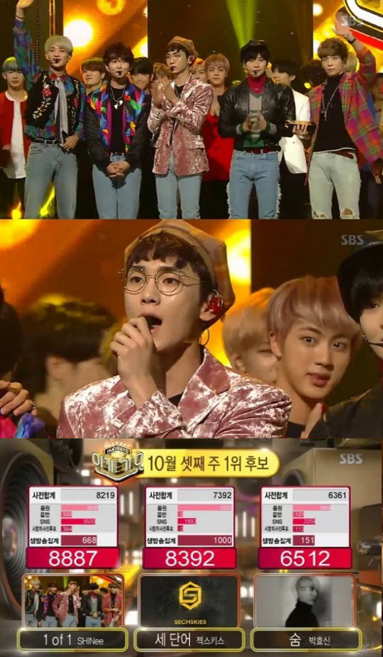 16일 방송된 '인기가요'에서는 샤이니의 '1of1'가 젝스키스 '세 단어', 박효신 '숨'과의 1위 대결에서 1위를 차지했다. 샤이니는 "한 주동안 상받을 수 있게 해준 샤이니 월드 감사합니다"라고 팬들에게 고마운 마음을 전했다.