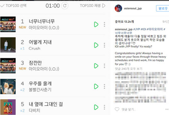 17일 박진영은 자신의 인스타그램에 "너무너무너무 축하해 얘들아. 다들 정말 바쁘고 힘든 와중에도 밝게 웃으며 열심히 하던 모습들이 생각나네"라는 글과 함께 아이오아이 신곡이 음원차트 1위를 기록한 사진을 게재했다.